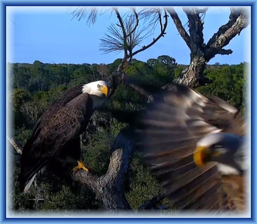 Around noon. there was an intruder overhead. Samson was perched in the pine and began alarm calling. He flew off and two eagles could be seen flying circles over the nest tree. Samson returned unscathed and remained perched in the pine for a good 90 min. This is HIS nest tree!! Yesterday and today, Samson brought a fish to the nest that he ate. By afternoon, Samson was back perched in the pine and A2 later joined him, vocalizing on her approach. She is very loud!!