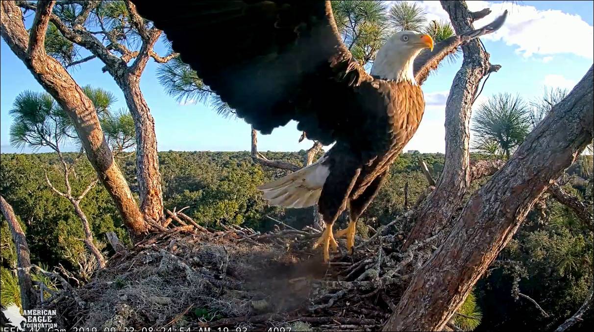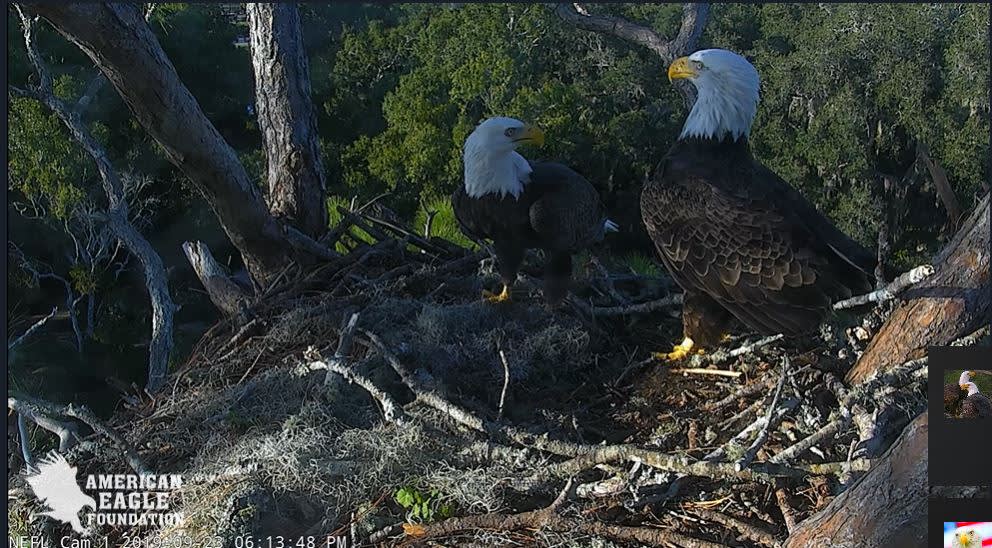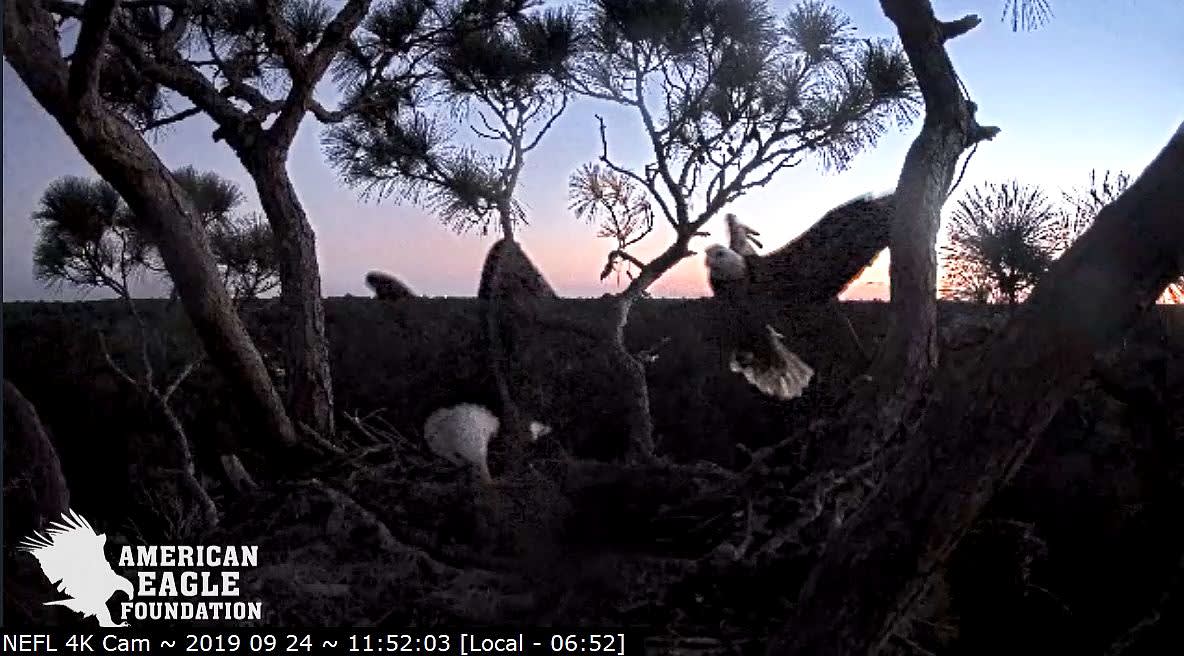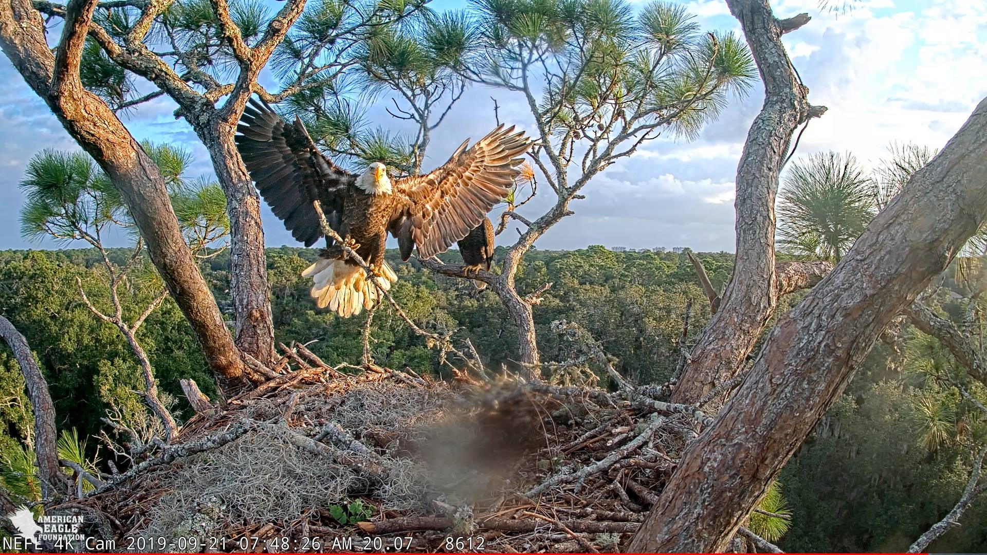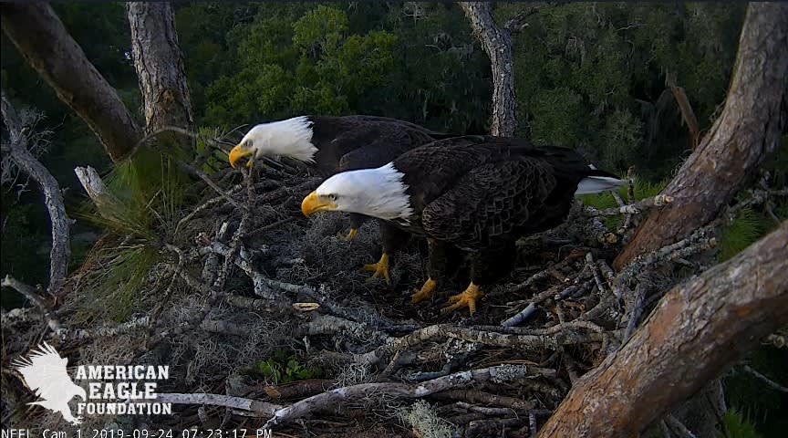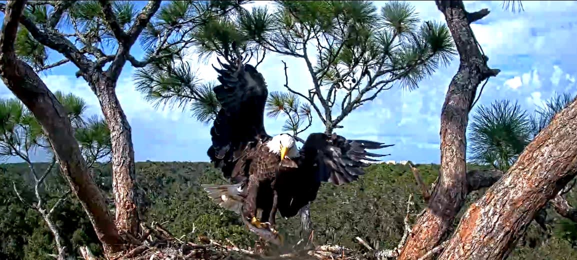 754 AM - Morning nestorations with A2 bringing in a big stick to the nest. Samson was right on her heels as she flew in. He perched in the pine. but then joined her in the nest.